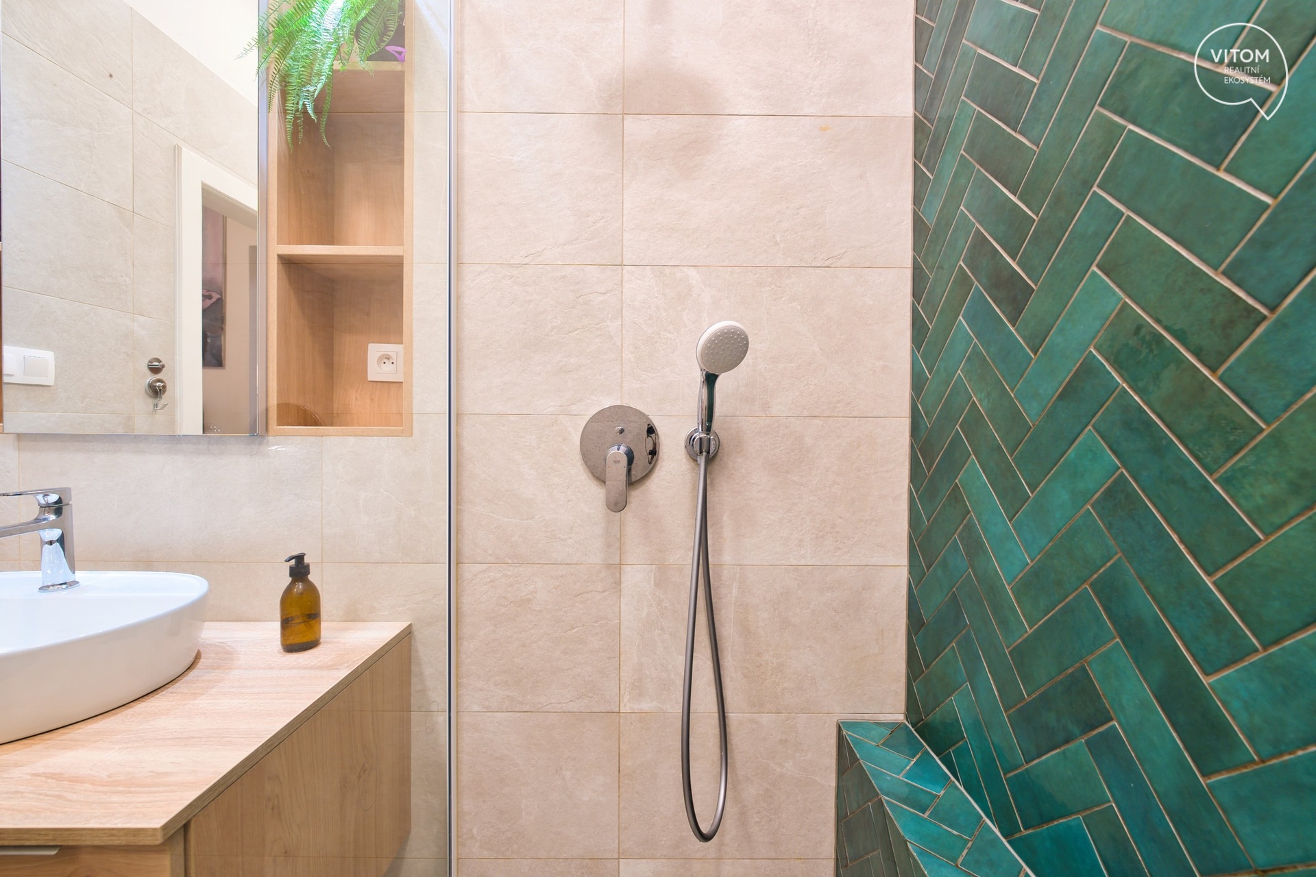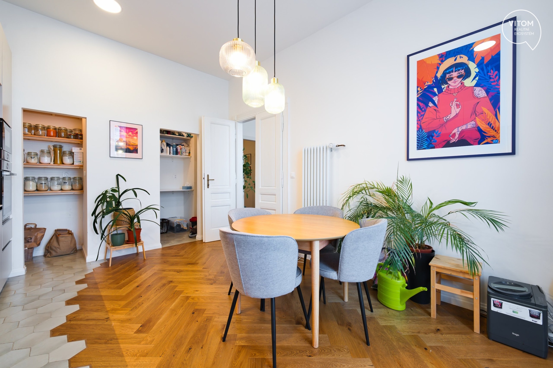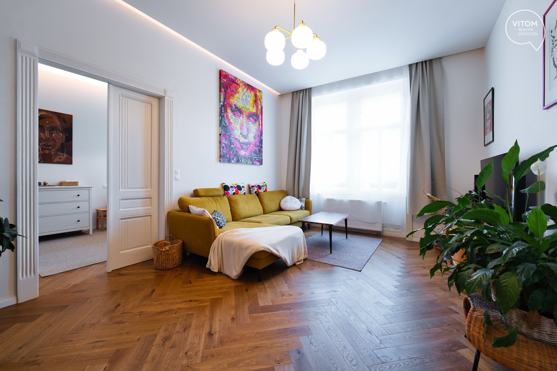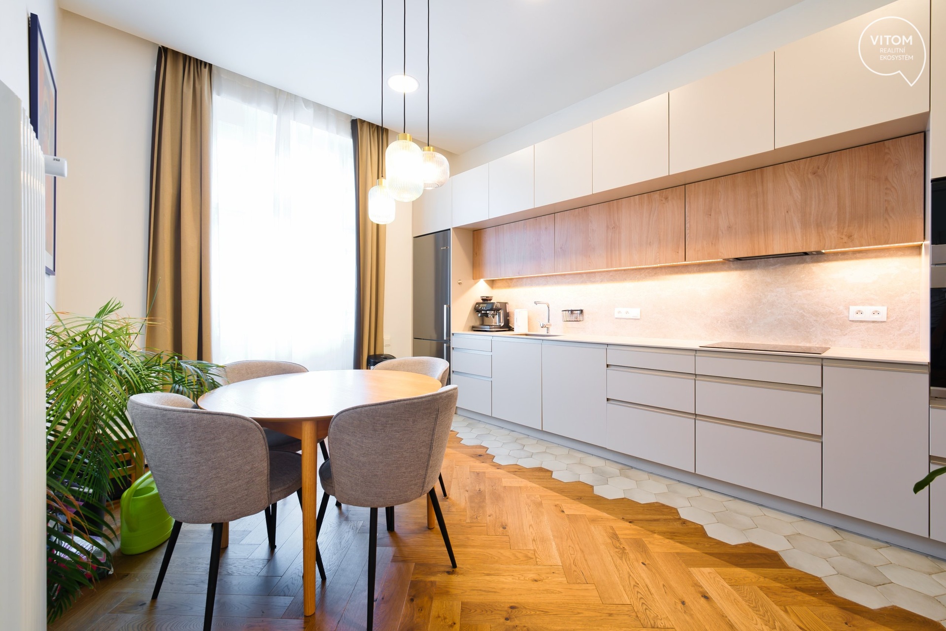 Dominantou bytu je moderně navržená kuchyň, která je vybavena kvalitními spotřebiči Bosch. Byt disponuje dvěmi samostatnými ložnicemi pro dostatek soukromí, a také obývacím pokojem pro společný rodinný život.