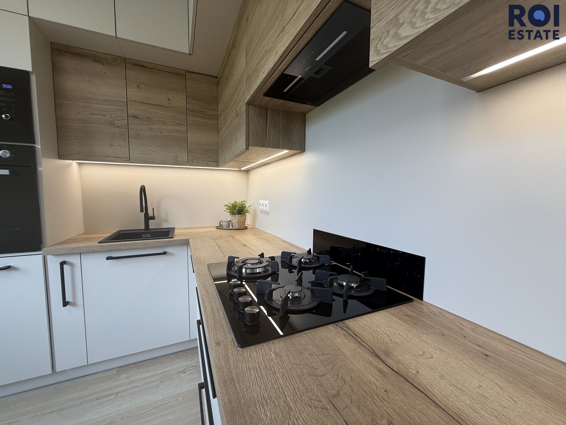 Dominantou je moderní kuchyňská linka na míru s vestavěnými spotřebiči a dostatkem úložného prostoru – ideální jak pro každodenní fungování, tak i pro chvíle, kdy chcete vařit s radostí.